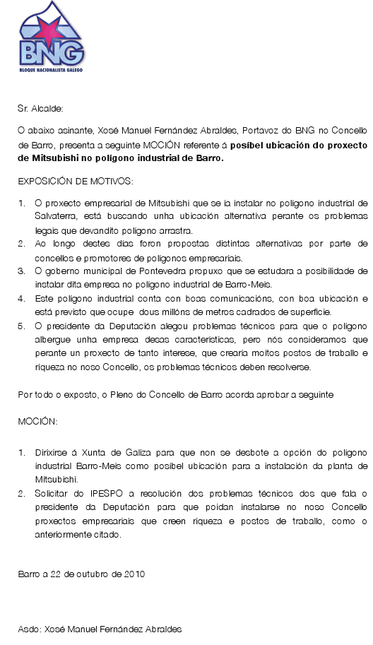 Moción referente a ubicación do proxecto de Mitsubishi
