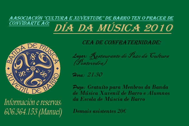Queremos compartir esta cea con todos os socios, alumnos da escola, musicos da banda e con todo aquel que desexe celebrar connosco o día da música.