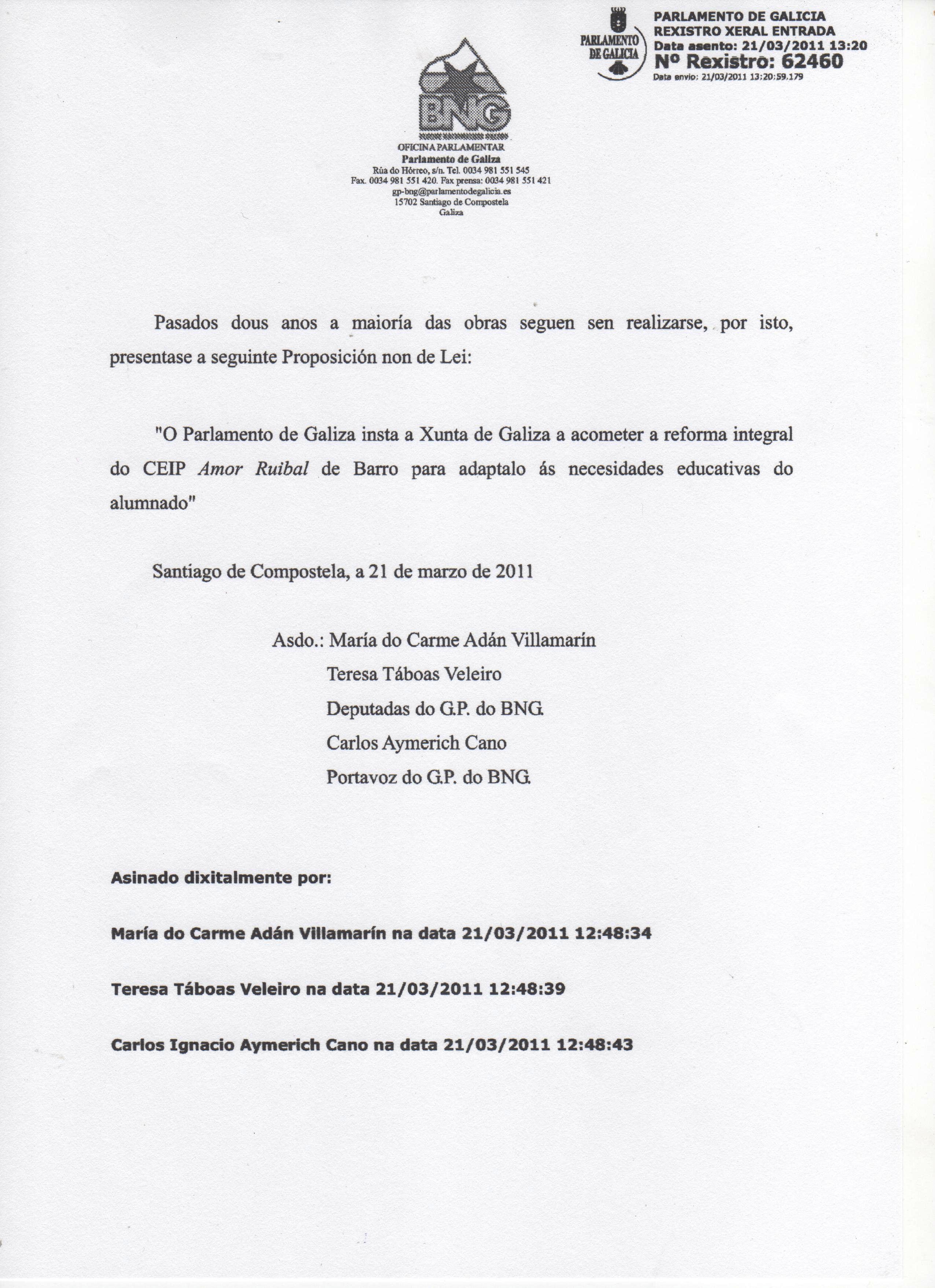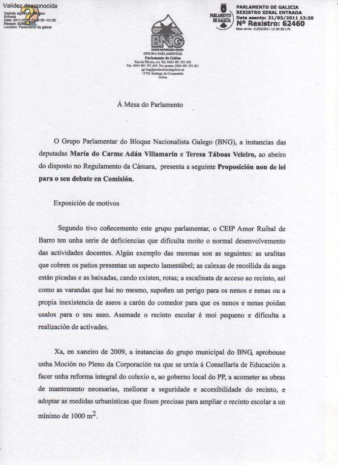 “O Parlamento de Galiza insta a Xunta de Galiza a acometer a reforma integral do CEIP Amor Ruibal de Barro para adaptalo ás necesidades educativas do alumnado”