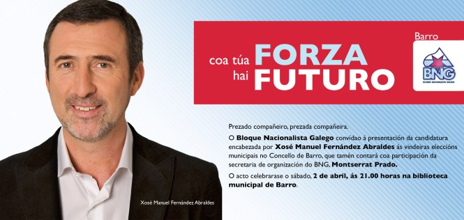 O vindeiro sábado, día 2 de abril, o BNG presentará a candidatura coa que concorrerá ás eleccións municipais do mes de maio. Farao nun acto público que terá lugar ás 21 h. Na biblioteca municipal. Neste acto intervirá, ademais do candidato á alcaldía de Barro, Xosé Manuel Fernández Abraldes, a Secretaria de Organización do BNG, Montserrat Prado.