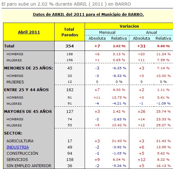 O PARO SUBE UN 2.02 % DURANTE O MES DE ABRIL EN BARRO