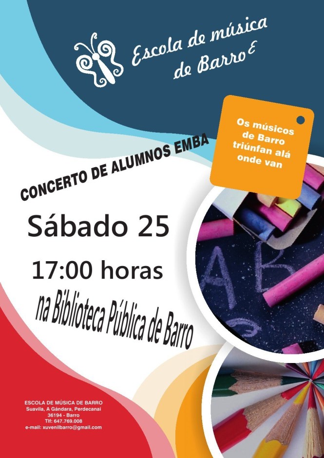 Concerto de alumnos da Escola de Música de Barro.Hoxe ás 17:00 horas na Biblioteca Pública de Barro. Esperamosvos.