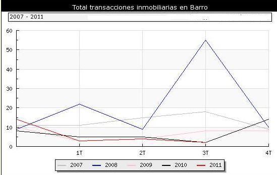 En todo o ano 2011 o nº de transacciones no municipio de Barro foi de 9 un -25,00% menos que no mesmo periodo do ano anterior ata o 3º trimestre (12 Transacciones).