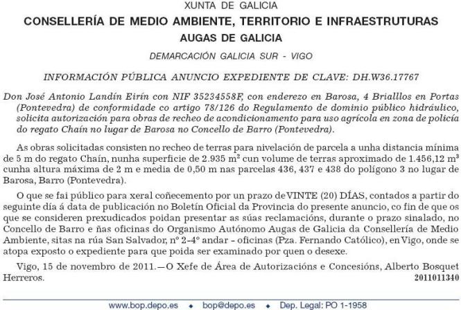 Autorización de recheo no regato Chaín no Lugar de Barosa