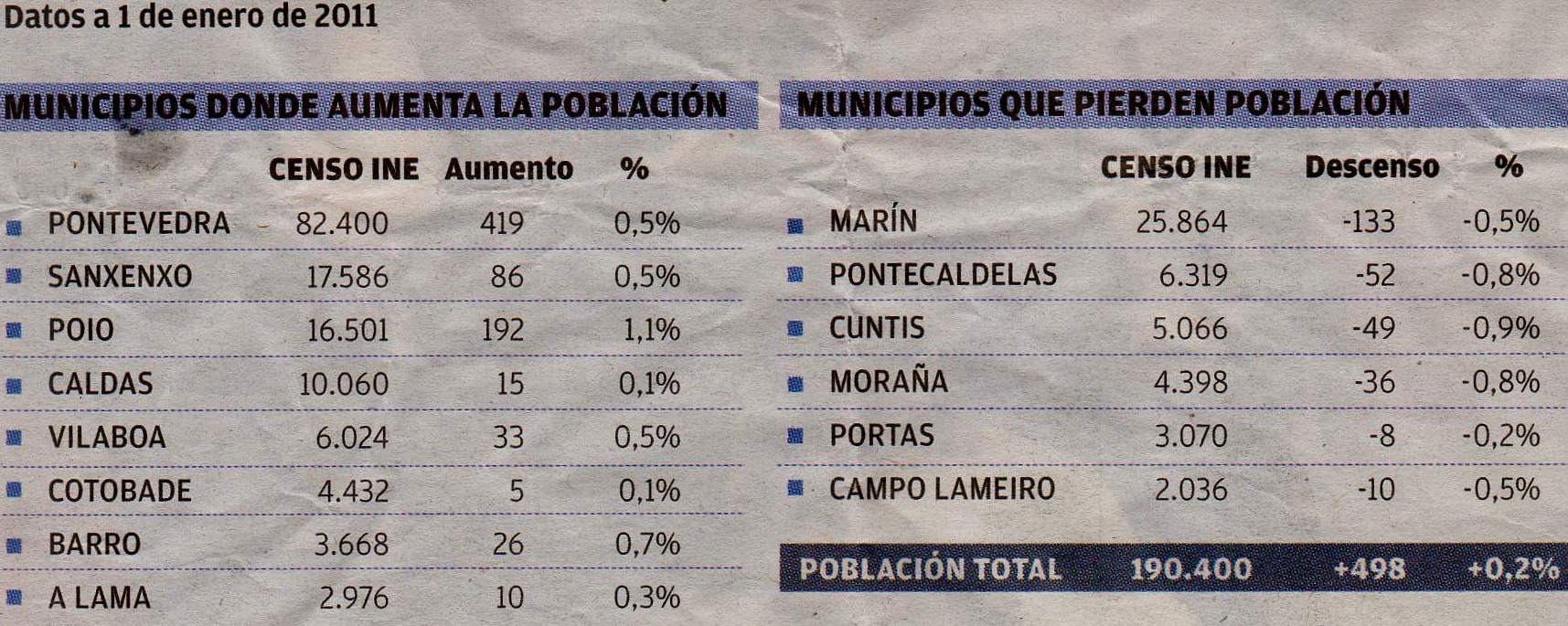 Municipios cunha historia de crecemento desde 2007 mantéñena neste exercicio, como é o caso de Barro, Caldas, Sanxenxo e Vilaboa, mentres que no caso contrario chama especialmente a atención a evolución en Marín. Por primeira vez no últimos cinco anos este municipio rexistra un descenso do seu censo e perde unha nada desdeñable cifra de 133 veciños, un 0,5% de caída, para quedar, segundo o INE en 25.864 habitantes.