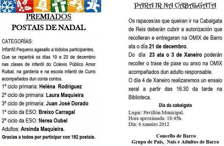 CABALGATA DE REIS 22 Decembro 2011Barro Deixar un comentario Ampliase o prazo de entrega de autorizacións para ir na Cabalgata ata o día 31 de decembro de 2011. Recollida da solicitude na OMIX de Barro. 42.525000 -8.647222 Compartir: Compartir en Facebook (Se abre en una ventana nueva) Facebook Share on X (Se abre en una ventana nueva) X Share on LinkedIn (Se abre en una ventana nueva) LinkedIn Compartir en Tumblr (Se abre en una ventana nueva) Tumblr Share on Pinterest (Se abre en una ventana nueva) Pinterest Share on Reddit (Se abre en una ventana nueva) Reddit Email a link to a friend (Se abre en una ventana nueva) Correo-e Imprimir (Se abre en una ventana nueva) Imprimir Gústame Cargando... Relacionado