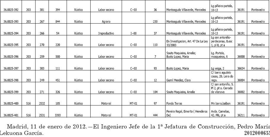 El Proyecto podrá ser consultado, además de en las dependencias de esta Jefatura (Plaza de los Sagrados Corazones, nº 7, 1ª planta, 28036 Madrid), en las oficinas del Ayuntamiento en cuyo Término Municipal radican los bienes afectados y en la Subdelegación del Gobierno en Pontevedra.
