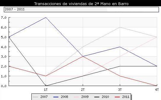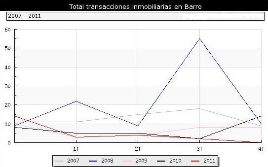 En todo o ano 2011 o n.º de transaccións no municipio de Barro foi de 9 un -65,38% menos que no mesmo período do ano anterior ata o 4º trimestre (26 Transaccións).