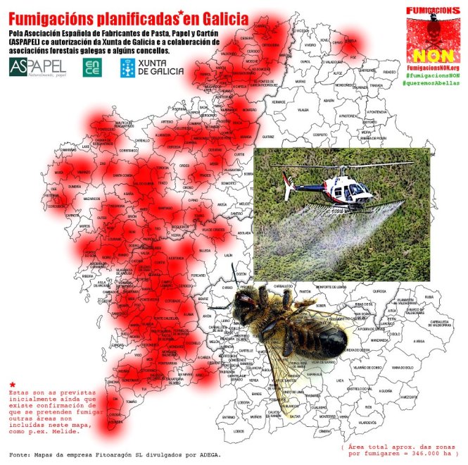 A Xunta ten previsto fumigar 350 mil hectáreas en todo o País para acabar con non sei que praga que afecta o eucalipto (a instancia da industria papeleira que promove ese monocultivo). O que non din é que estas accións poden estar detrás da progresiva desaparición das abellas e que supostamente hai risco para a saúde humana. Velaqui o mapa, parece que a Barro lle toca de cheo.