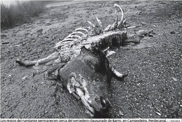 As inmediacións do vertedoiro de lixo clausurado en Barro aínda acollen a tétrica presenza dunha vaca en estado de descomposición na que, a simple vista, se aprecian varias evidencias do que puido ser maltrato animal.