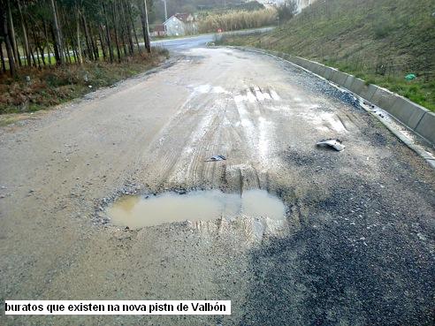 • A nova pista que se construíu para comunicar o lugar de Valbón coa zona da Estación da Portela. A pesar de que este vial se fixo novo, ao anular o trazado da vía o acceso existente até ese momento, a súa execución, a presa e correndo, foi unha verdadeira chapuza, limitándose a botar un pouco de aglomerado e gravilla sobre un terreo pouco firme e que non reunía as mínimas condicións para ser unha obra duradeira. Unha vez máis o goberno municipal do PP mantivo unha actitude de compricidade ou, cando menos, de silencio diante dunha execución chapuceira.