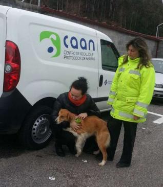 Ana Angueira abraza o can que recolleu en Curro ante a mirada de Olga Costa. Ao fondo, furgoneta de recolleita da perrera provincial.