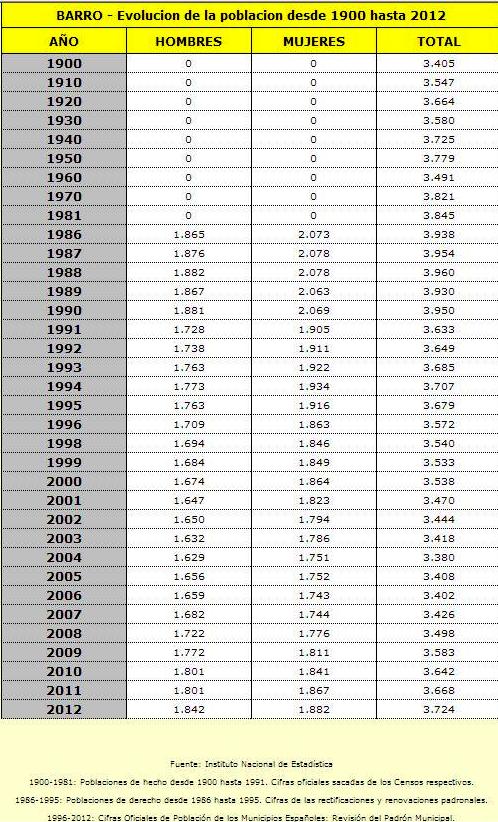 Evolución da poboación dende 1900 ata 2012 -Concello de Barro