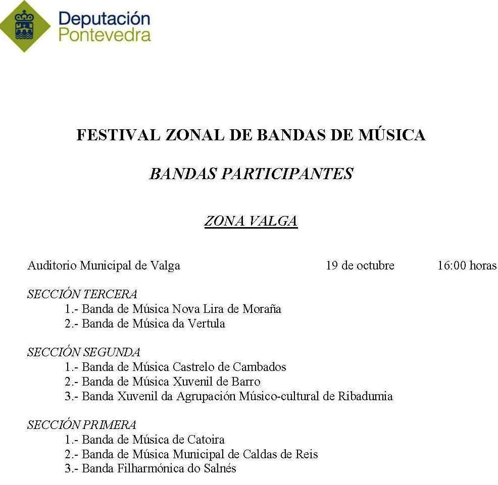 Deputación de Pontevedra, no seu afán de colaborar co desenvolvemento e a actividade das bandas de música desta provincia, convoca o II Festival Zonal de Bandas de Música Deputación de Pontevedra, que terá lugar os días 19, 26 e 27 de outubro, e 9 e 10 de novembro
