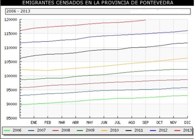 A continuación mostramos a evolución dos ultimos anos do numero de emigrantes censados no estranxeiro de Barro, e de toda a provincia de Pontevedra.
