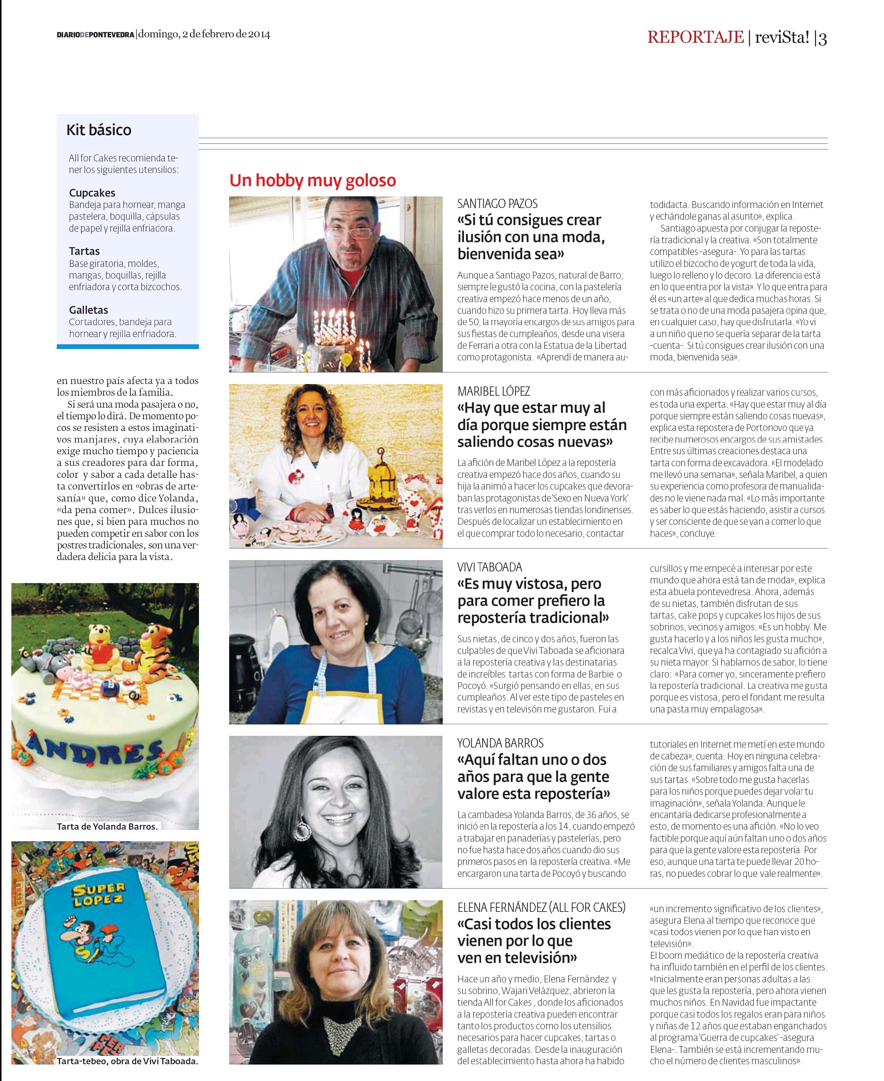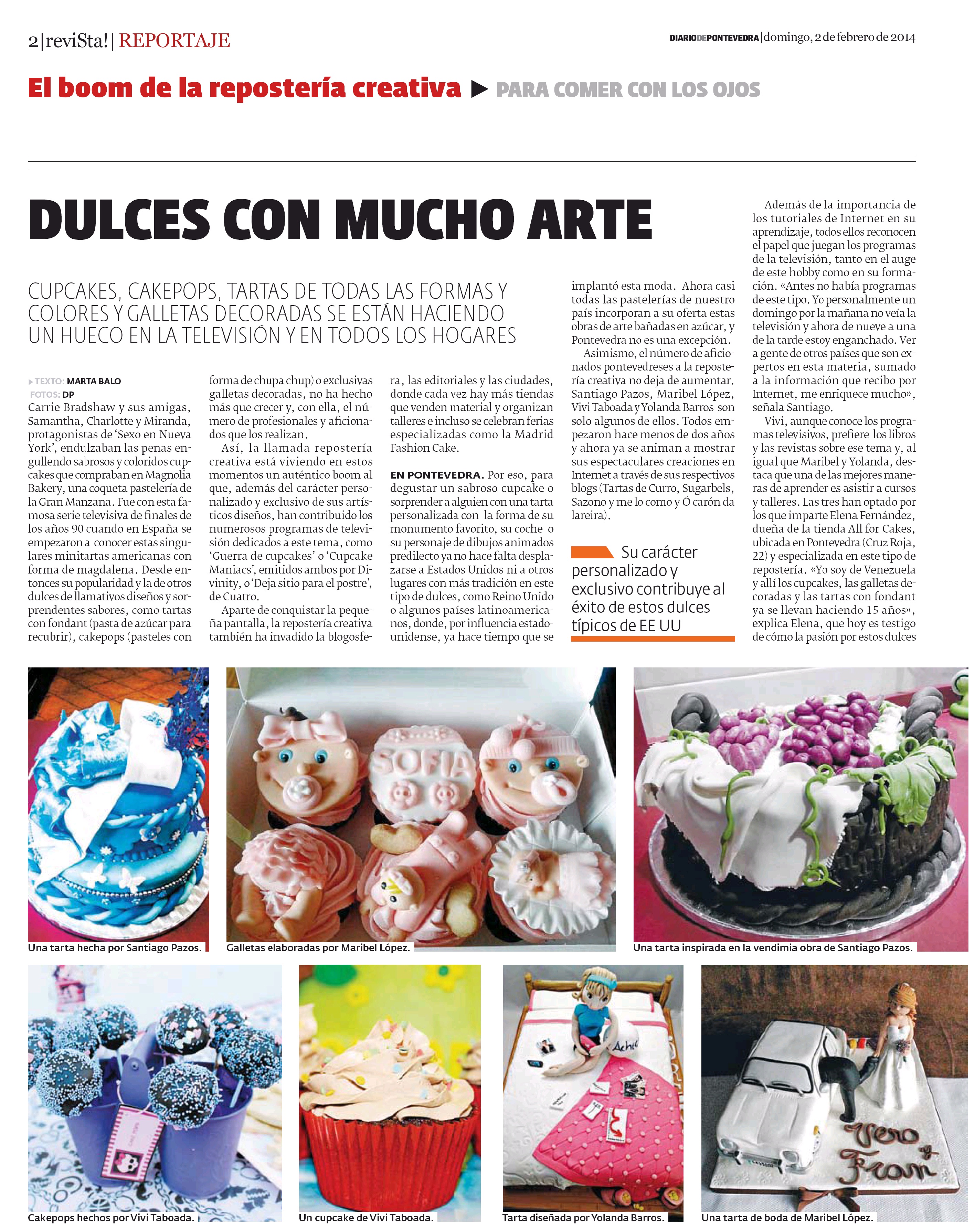 Aínda que a Santiago Pazos, natural de Barro, sempre lle gustou a cociña, coa pastelaría creativa empezou hai menos dun ano, cando fixo a súa primeira torta. Hoxe leva máis de 50, a maioría encargos dos seus amigos para as súas festas de aniversario, dende unha viseira de Ferrari a outra coa Estatua da Liberdade como protagonista. Aprendín de xeito autodidacta. Buscando información en Internet e botándolle ganas ao asunto», explica.