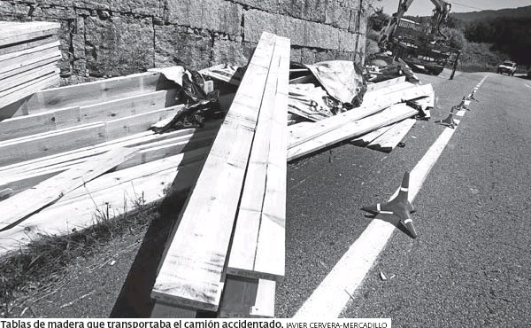 O vehículo que, segundo o condutor do coche que o seguía, circulaba a unha velocidade axeitada, podería levar as táboas de madeira mal suxeitas polo que perdeu parte da carga sobre a estrada.