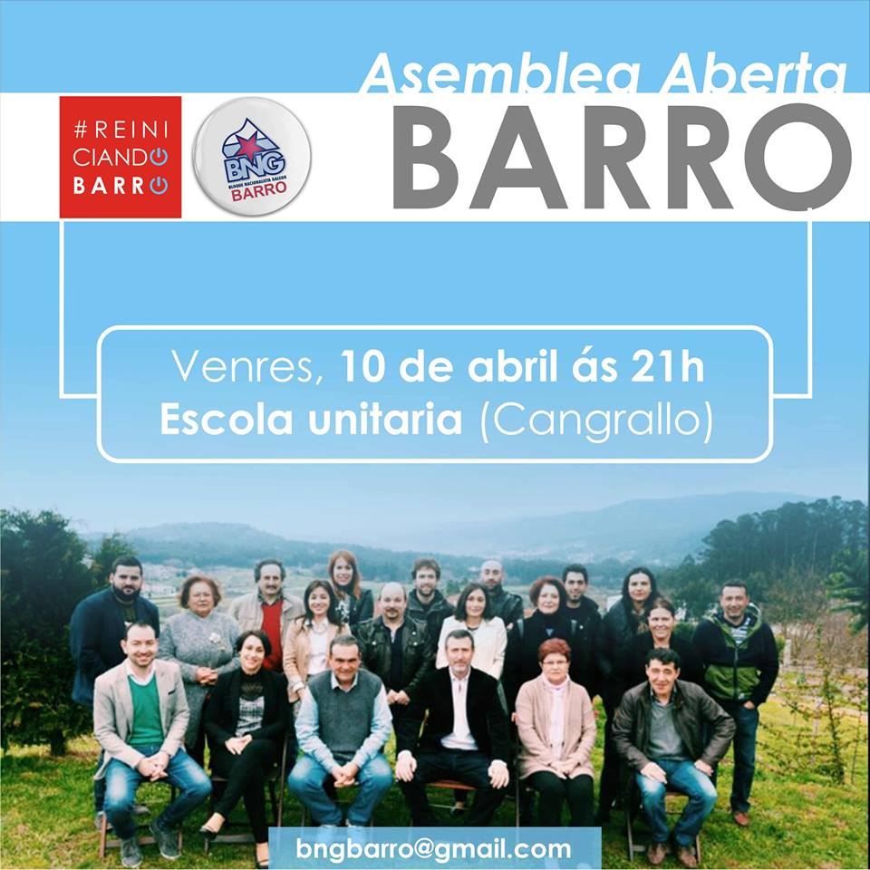 O BNG comeza unha rolda de Asembleas Abertas parroquiais e abrimos pola de Barro. Queremos explicar as nosas propostas para mellorar o concello e a parroquia e tamén escoitar as propostas que @s veciñ@s nos queiran achegar.