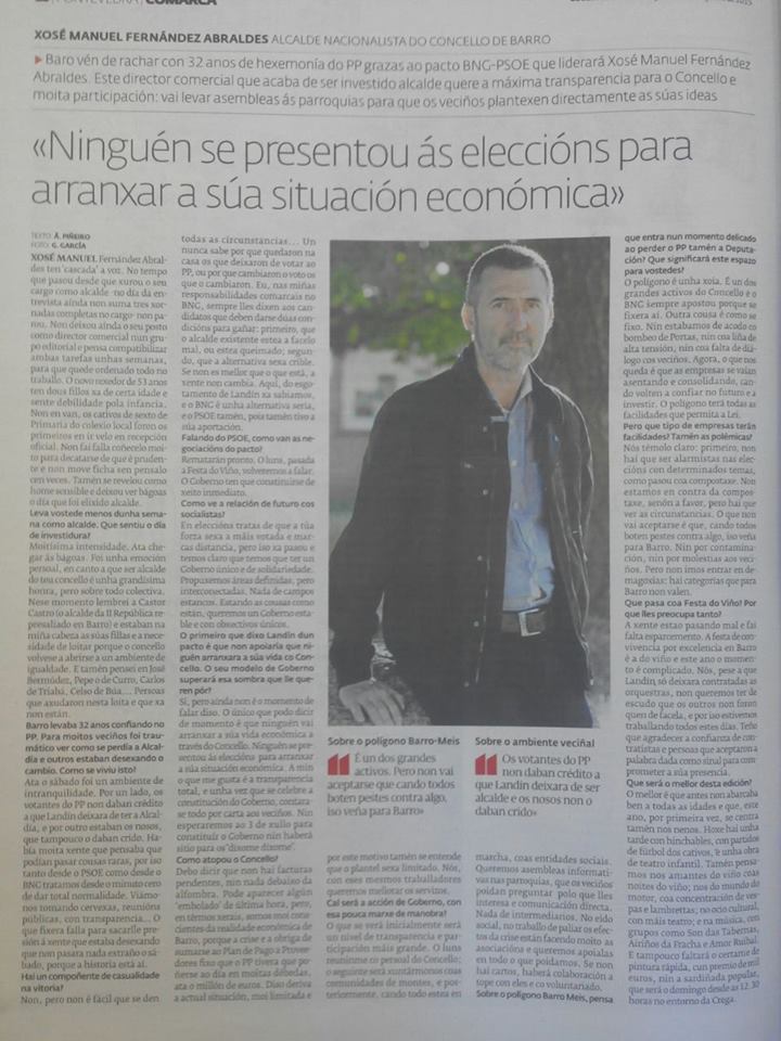 Barro vén de rachar con 32 anos de hexemonía do PP grazas ao pacto BNG-PSOE que liderará Xosé Manuel Fernández Abraldes. Este director comercial que acaba de ser investido alcalde quere a máxima transparencia para o Concello e moita participación: vai leva