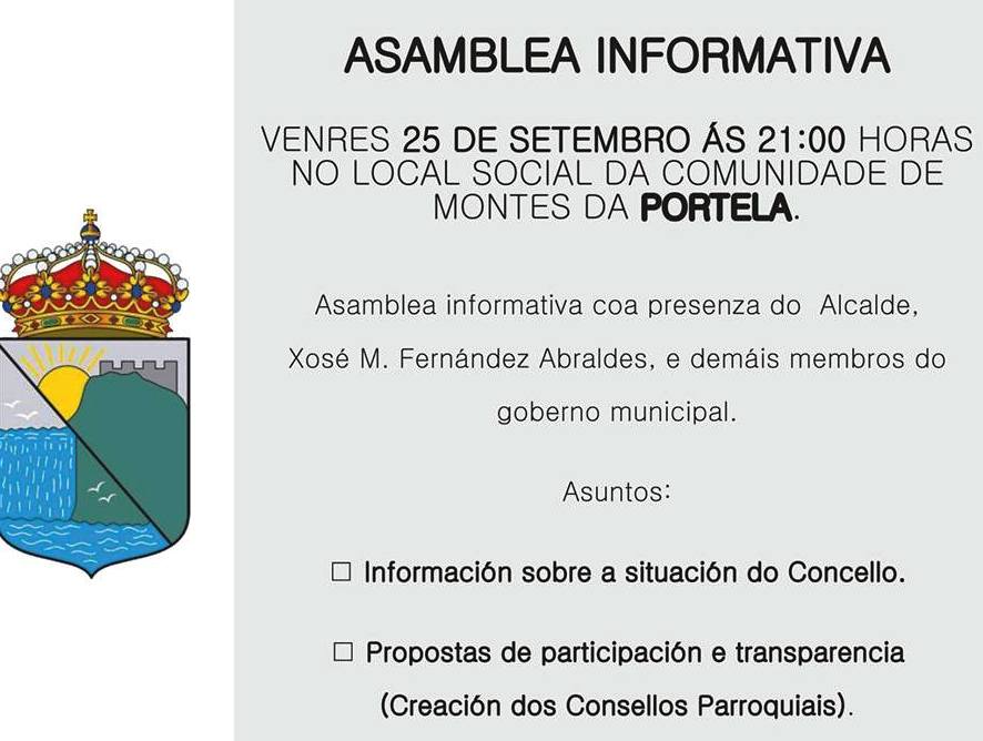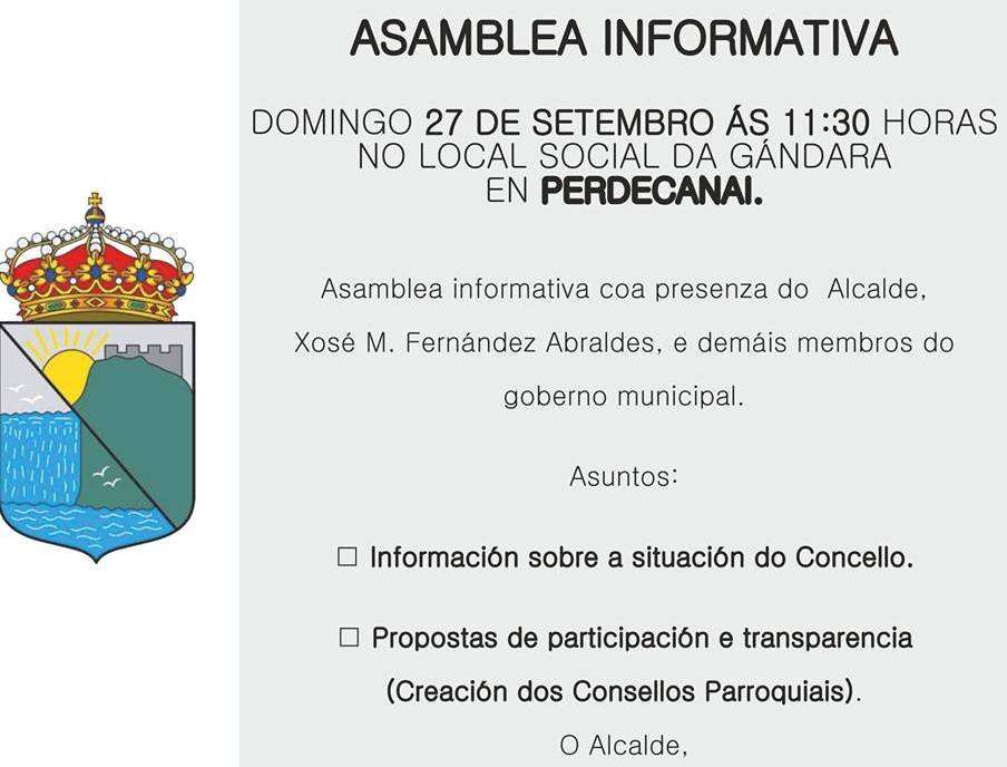 ASAMBLEAS INFORMATIVAS 24 Setembro 2015Barro Deixar un comentario Esta fin de semana celebranse tres asambleas parroquiais: o venres na Portela (21h) o sábado en Barro (21h) e o domingo en Perdecanai (11:30). Compartir: Feixe clic para compartir en Facebook (Se abre en una ventana nueva) Facebook Fai clic para compartir en X (Se abre en una ventana nueva) X Compartir en Linkedin (Se abre en una ventana nueva) LinkedIn Compartir en Tumblr (Se abre en una ventana nueva) Tumblr Compartir en Pinterest (Se abre en una ventana nueva) Pinterest Compartir en Pocket (Se abre en una ventana nueva) Pocket Compartir en Reddit (Se abre en una ventana nueva) Reddit Fai clic para enviar unha ligazón por correo electrónico a un amigo (Se abre en una ventana nueva) Correo-e Imprimir (Se abre en una ventana nueva) Imprimir Gústame Cargando... Relacionado