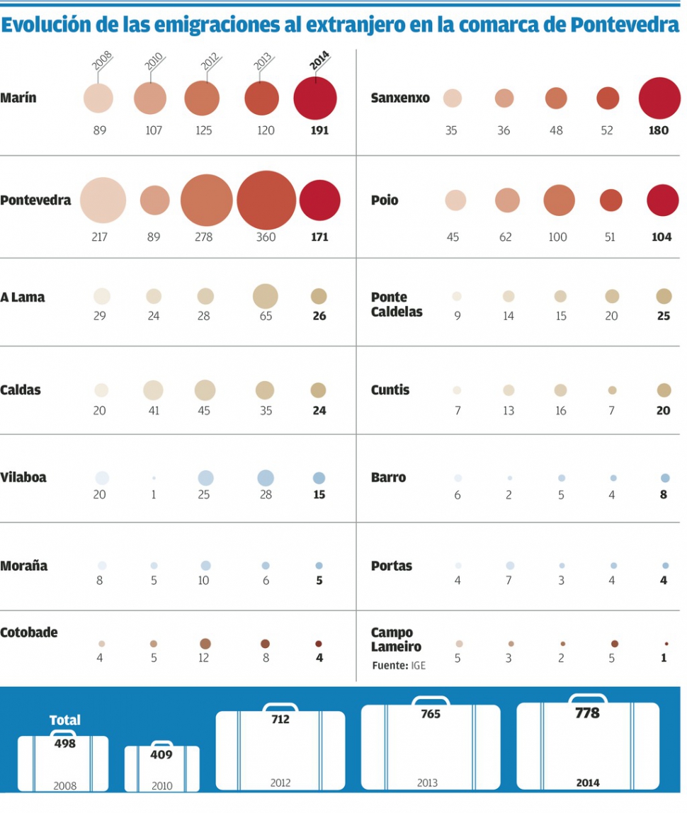 Poio que logrou diminuír o número de emigrantes que se van no seu conxunto, non evitou con todo un importante incremento das persoas que se van ao estranxeiro e Marín é outro dos municipios que o ano pasado bateu a súa marca de emigrantes desde que se iniciou a crise cun total de 191 veciños que se foron a buscar fortuna a outro país, un número aínda maior que o da propia capital. Un dos casos máis singulares é o de Sanxenxo que case cuadriplicou o seu número de emigrantes nun ano pasando de 52 en 2013 a 180 no pasado exercicio.