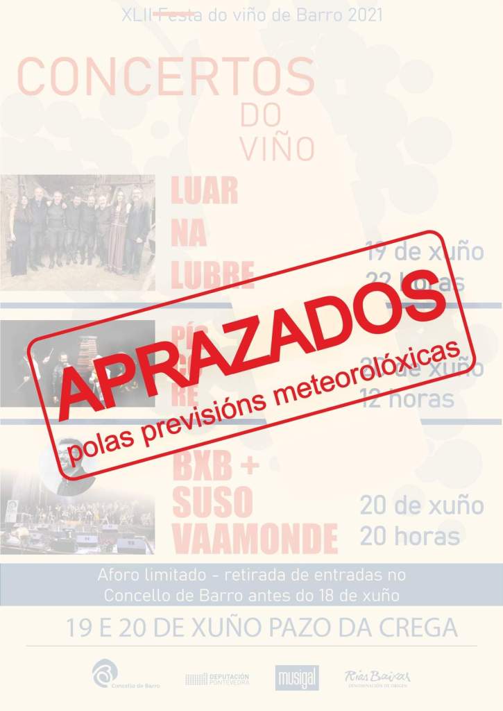 O Goberno municipal tomou a decisión de aprazar os Concertos do Viño programados para esta fin de semana por causa das previsións de choiva tanto para o sábado como para o domingo e ante a imposibilidade de trasladar o evento a un lugar cuberto cumprindo coas normas de distanciamento social ditadas polas autoridades sanitarias.