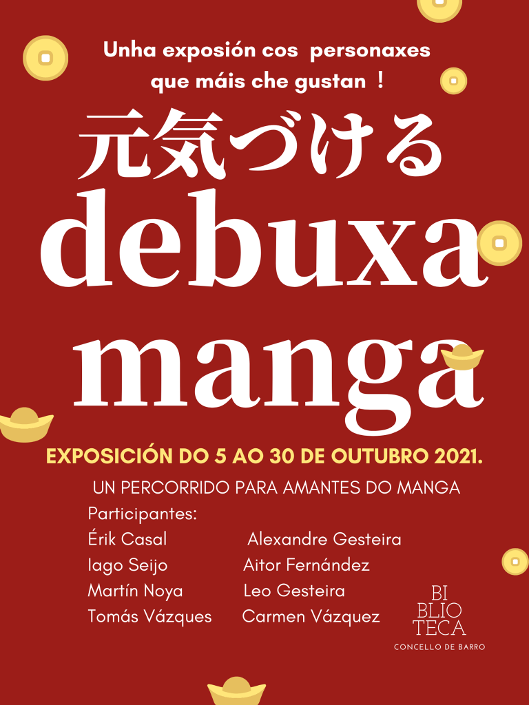 Exposición “Debuxa Manga” 5 Outubro 2021Barro Deixar un comentario DEBUXA MANGA.Xa podedes pasar pola Biblioteca de Barro para ver a nosa Exposición “Debuxa Manga” un percorrido polo Manga, dende diferentes idades.Inauguración este xoves 7 de outubro de 2021.Agardámosvos.Grazas a tódol@s participantes. Compartir: Feixe clic para compartir en Facebook (Se abre en una ventana nueva) Facebook Fai clic para compartir en X (Se abre en una ventana nueva) X Compartir en Linkedin (Se abre en una ventana nueva) LinkedIn Compartir en Tumblr (Se abre en una ventana nueva) Tumblr Compartir en Pinterest (Se abre en una ventana nueva) Pinterest Compartir en Pocket (Se abre en una ventana nueva) Pocket Compartir en Reddit (Se abre en una ventana nueva) Reddit Fai clic para enviar unha ligazón por correo electrónico a un amigo (Se abre en una ventana nueva) Correo-e Imprimir (Se abre en una ventana nueva) Imprimir Gústame Cargando... Relacionado