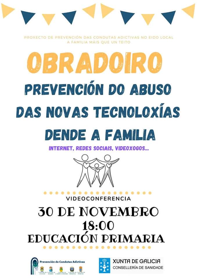O próximo martes 30 de novembro ás 18:00h realizarase a través do Proxecto de prevención das condutas adictivas no eido local de Cuntis, Barro, Campo Lameiro, Moraña e Portas un Obradoiro de 𝗣𝗥𝗘𝗩𝗘𝗡𝗖𝗜Ó𝗡 𝗗𝗢 𝗔𝗕𝗨𝗦𝗢 𝗗𝗔𝗦 𝗡𝗢𝗩𝗔𝗦 𝗧𝗘𝗖𝗡𝗢𝗟𝗢𝗫Í𝗔𝗦 𝗗𝗘𝗡𝗗𝗘 𝗔 𝗙𝗔𝗠𝗜𝗟𝗜𝗔, destinado ás familias do alumnado de Educación Primaria (o 14 de decembro realizarase un Obradoiro semellante destinado ás familias do alumnado da ESO).