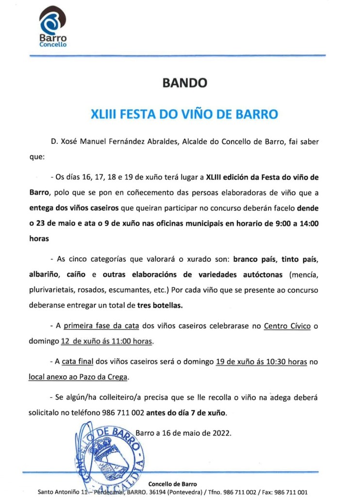 O prazo para a presentación dos viños para o concurso de viños caseiros vai desde o 23 de maio ata o 9 de xuño.