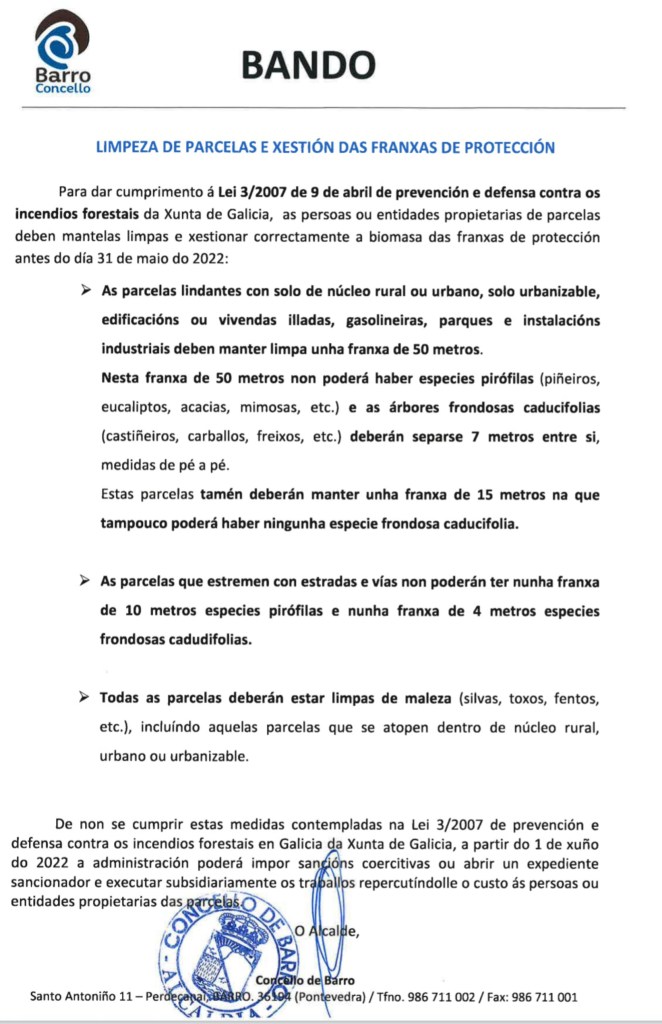 Para dar cumprimento á Lei 3/2007 de 9 de abril de prevención e defensa contra os incendios forestais da Xunta de Galicia, as persoas ou entidades propietarias de parcelas deben mantelas limpas e xestionar correctamente a biomasa das franxas de protección antes do día 31 de maio do 2022: