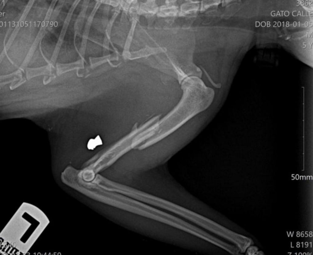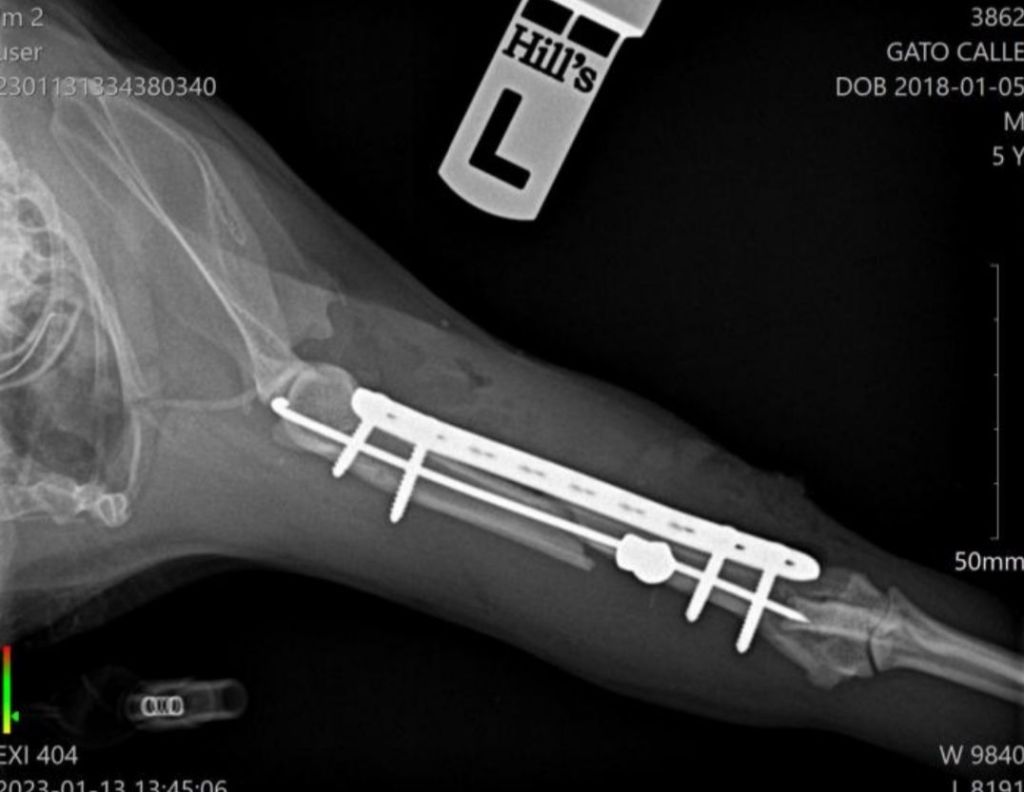 Lin permanece ahora recuperándose con analgesia y antibiótico a la espera de ver la evolución. Según indica el informe médico se trata de “fractura medial oblicua de húmero como consecuencia de disparo por arma de fuego con material alojado en la parte caudal del músculo tríceps braquial. Reducimos la fractura bajo anestesia general y la fijamos con aguja centromedular y placa bloqueada”