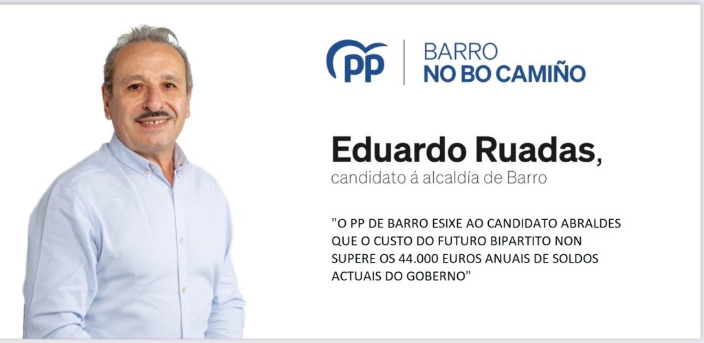 O Partido Popular de Barro, ante o inicio das negociacións entre o BNG e o PSOE para formar un goberno de coalicación no municipio, quere esixirlle publicamente ao alcalde en funcións e candidato, Xosé Manuel Fernández Abraldes, –que é a quen lle corresponde liderar este proceso por ser a lista máis votada– que o custo do futuro bipartito non supere en salarios os 44.000 euros anuais que se gastaron na lexislatura que está a piques de rematar.