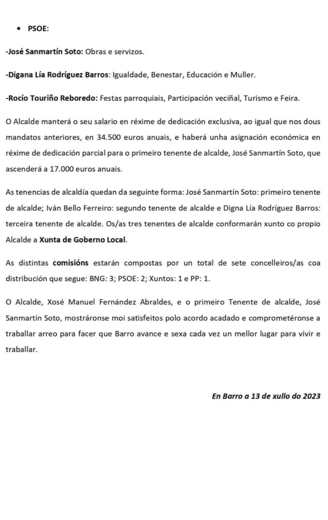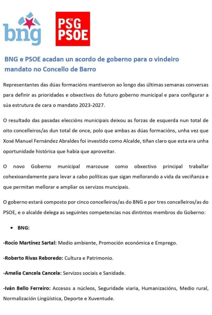 BNG E PSOE ACADAN UN ACORDO DE GOBERNO PARA O VINDEORO MANDATO NO CONCELLO DE BARRO