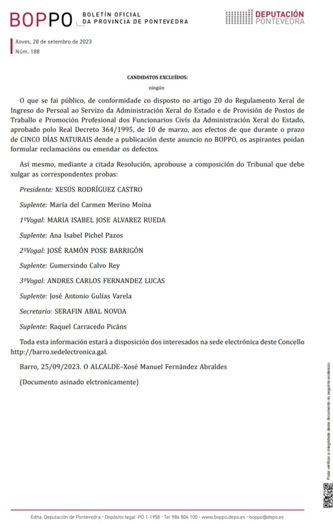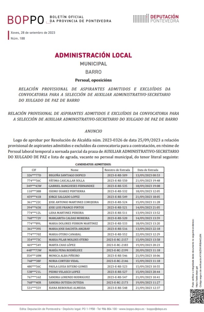RELACIÓN PROVISIONAL DE ASPIRANTES ADMITIDOS E EXCLUÍDOS DACONVOCATORIA PARA A SELECCIÓN DE AUXILIAR ADMINISTRATIVO-SECRETARIODO XULGADO DE PAZ DE BARRO