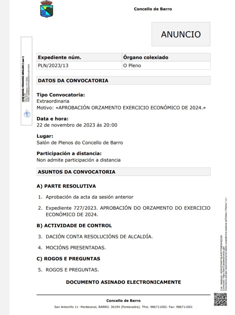Convocatoria de Pleno Extraordinario do Concello de Barro a celebrar o 22 de novembro de 2023 ás 20:00 horas.