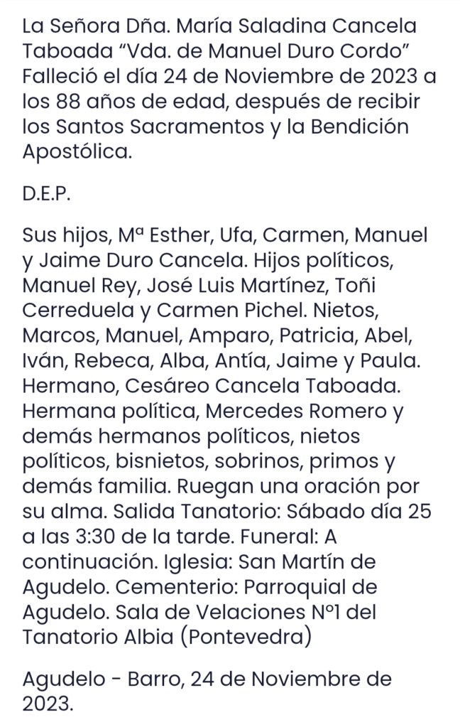 D.E.P. DOÑA MARÍA SALADINA CANCELA TABOADA