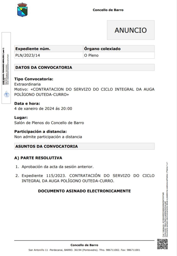 Convocatoria de sesión extraordinaria do Pleno do Concello de Barro que terá lugar o 4 de xaneiro de 2024 ás 20:00 horas.