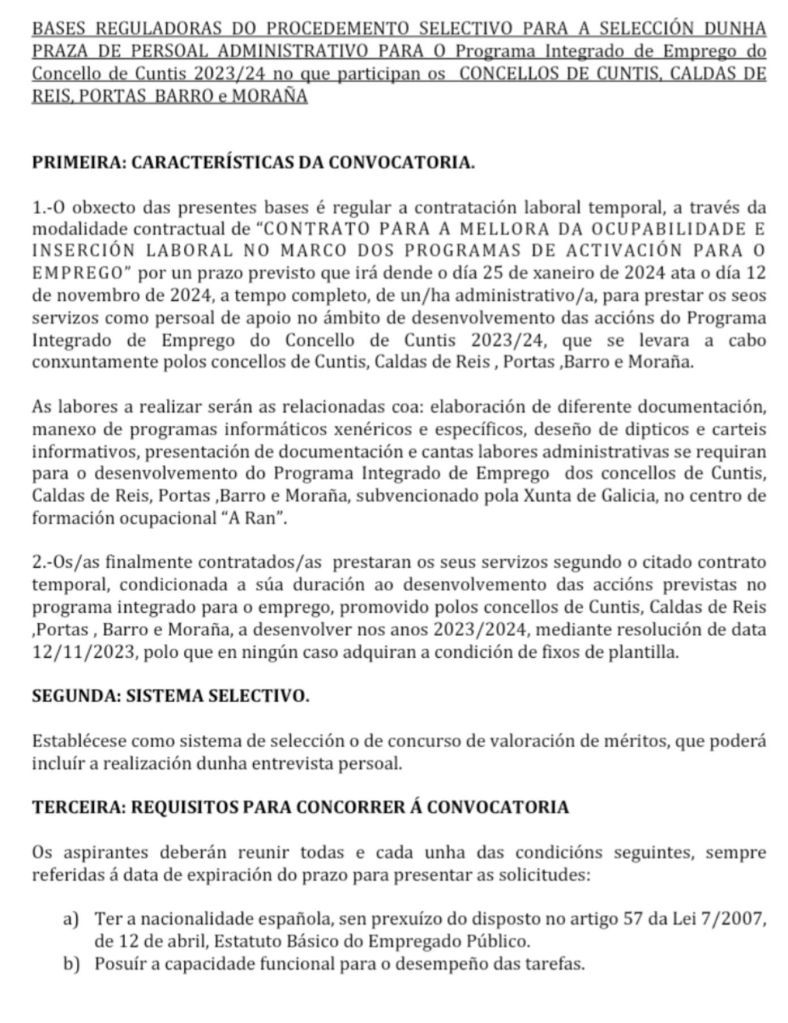- Bases reguladoras do procedemento selectivo para a selección dunha praza de persoal administrativo para o ” Programa Integrado de Emprego do Concello de Cuntis 2023/24 no que participan os concellos de Cuntis, Caldas de Reis, Portas, Barro e Moraña.