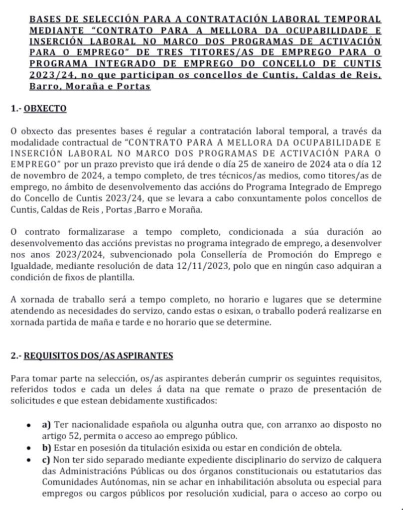 - Bases de selección para a contratación laboral temporal mediante ” Contrato para a mellora da ocupabilidade e inserción laboral no marco dos programas de activación para o emprego” de tres titores/as de emprego para o Plan Integrado de Emprego do Concello de Cuntis 2023/24 no que participan os concellos de Cuntis, Caldas de Reis, Portas, Barro e Moraña.