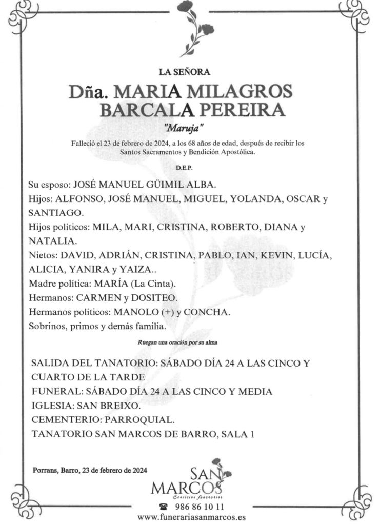 D.E.P. DÑA. MARÍA MILAGROS BARCALA PEREIRA