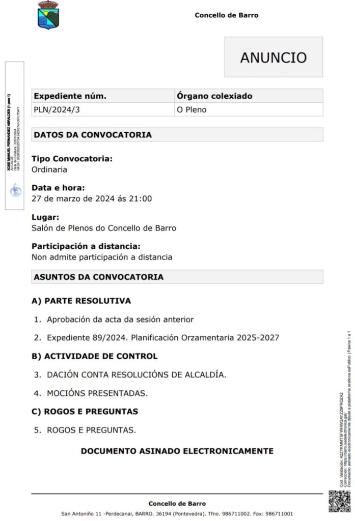 Convocatoria de sesión ordinaria do Pleno do Concello de Barro