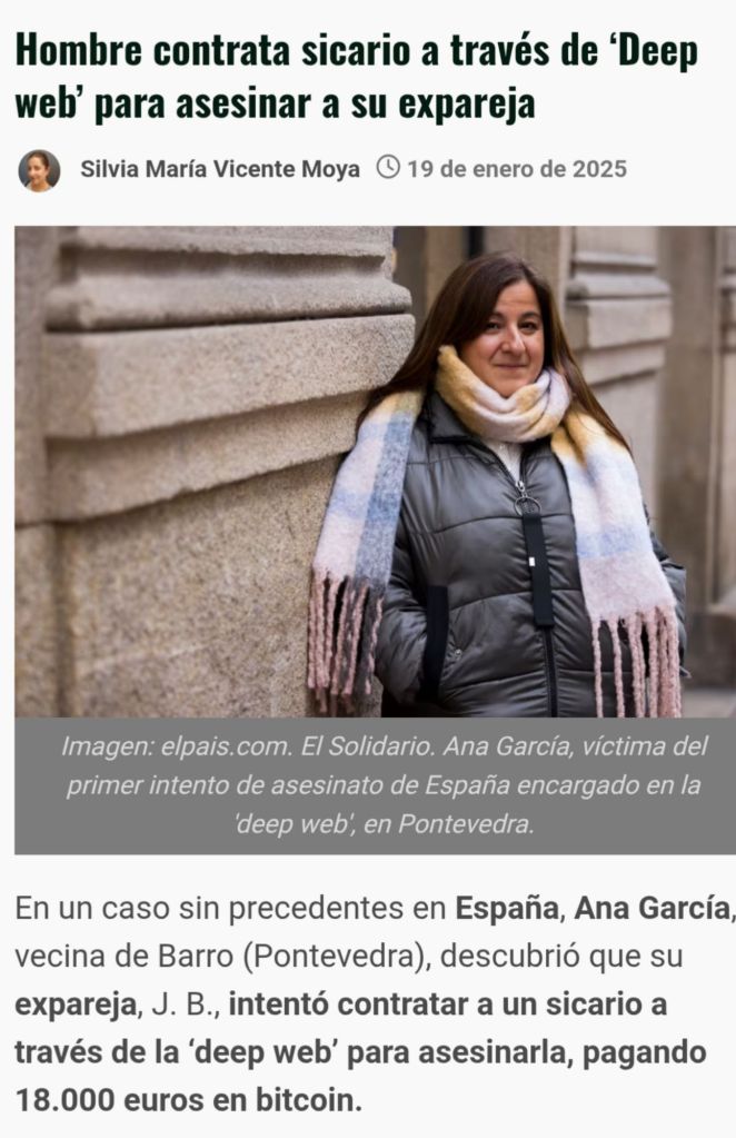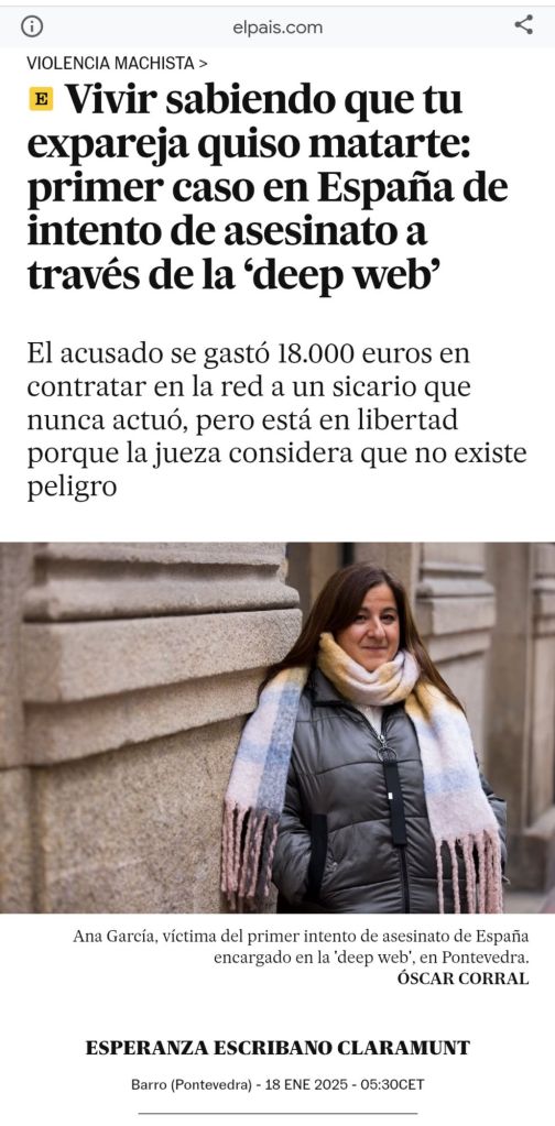 Contrata a un sicario a través da ‘Deep web’ para asasinar á súa exparella 19 Xaneiro 202519 Xaneiro 2025Barro Deixar un comentario https://elpais.com/espana/galicia/2025-01-18/vivir-sabiendo-que-tu-expareja-quiso-matarte-primer-caso-en-espana-de-intento-de-asesinato-a-traves-de-la-deep-web.html Compartir: Feixe clic para compartir en Facebook (Se abre en una ventana nueva) Facebook Fai clic para compartir en X (Se abre en una ventana nueva) X Compartir en Linkedin (Se abre en una ventana nueva) LinkedIn Compartir en Tumblr (Se abre en una ventana nueva) Tumblr Compartir en Pinterest (Se abre en una ventana nueva) Pinterest Compartir en Pocket (Se abre en una ventana nueva) Pocket Compartir en Reddit (Se abre en una ventana nueva) Reddit Fai clic para enviar unha ligazón por correo electrónico a un amigo (Se abre en una ventana nueva) Correo-e Imprimir (Se abre en una ventana nueva) Imprimir Gústame Cargando... Relacionado
