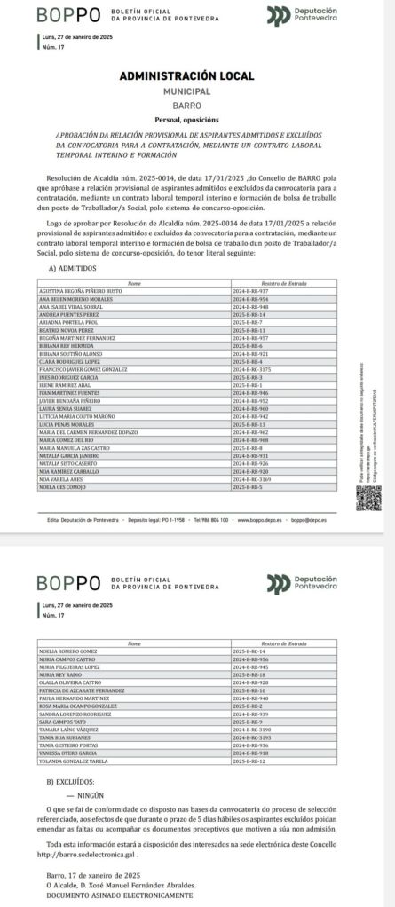 ANUNCIO BOPPO Nº17 DO 27/01/2025 LISTA PROVISIONAL DE CONVOCATORIA DE TRABALLADOR/A SOCIAL