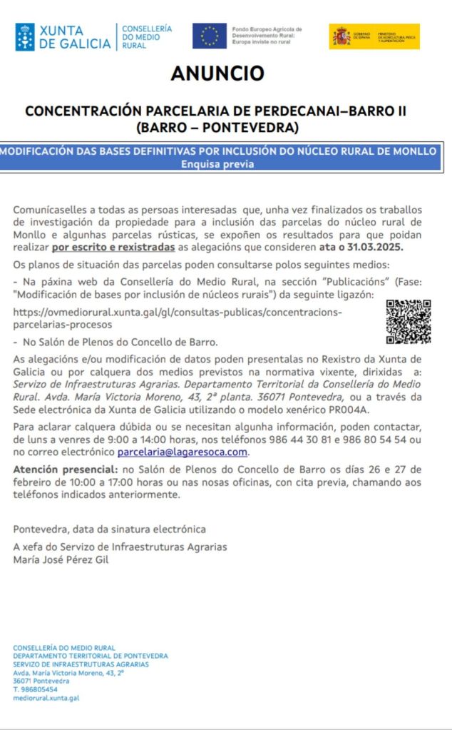 Anuncio Enquisa Previa MODIFICACIÓN BASES DEFINITIVAS POR INCLUSIÓN DO NÚCLEO RURAL DE MONLLO (CONCENTRACIÓN PARCELARIA PERDECANAI – BARRO II).