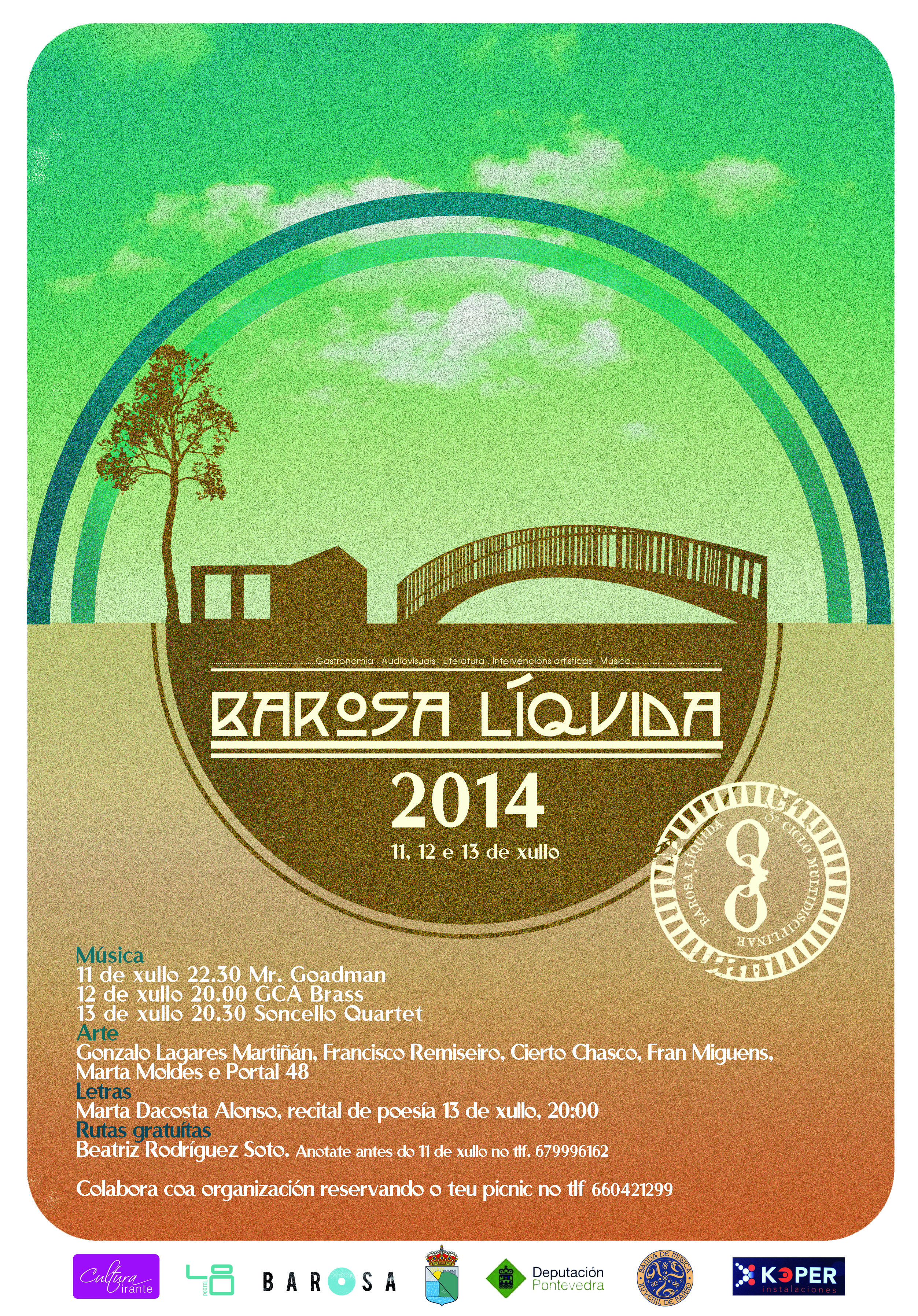 Cartel do Barosa líquida 2014. Os días 11, 12 e 13 de xullo no Parque Natural de Barosa. Concertos, instalacións artísticas, poesía, rutas e pinic colectivo… Vente a disfrutar dun entorno natural que estará cheo de arte.