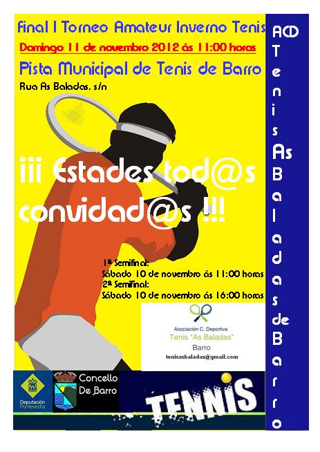 A ACD Tenis As Baladas quere invitar a tod@s os aficionad@s ao tenis e aos vecin@s de Barro a participar na final do evento, que destacará pola calidade deportiva dos finalistas.