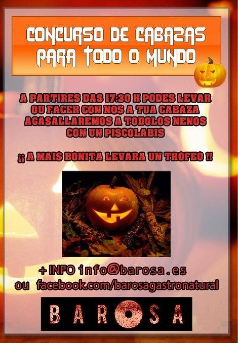 comarca. Por unha banda a Casa dos Druídas de Vilaboa acollerá o seu celebérrimo concurso de calacús e este ano a Muiñada Barosa, reconvertida en espazo cultural, ten unha proposta de cea temática e concurso de calacús. O último, desde as 17.00 horas de hoxe, con taller incluido e trofeos. A cea, por 25 euros para adultos, ten un suxestivo menú que se inicia con ‘ Tortilla de defuntos’ e segue con outros sete pratos igual de tétricos.