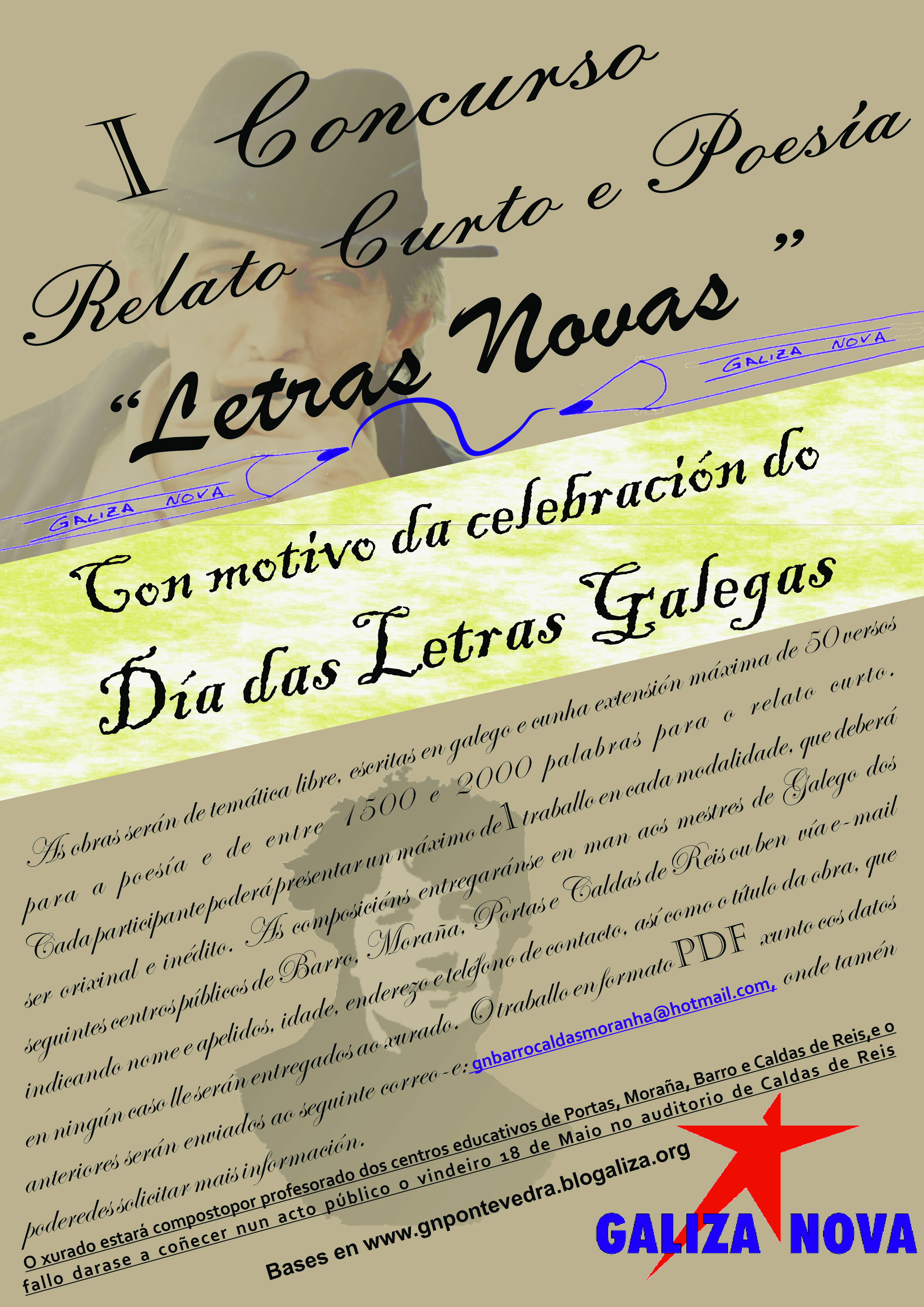 Con motivo da celebración do Día das Letras Galegas, a localidade conxunta de Galiza Nova Barro-Caldas-GN Moraña-Portas, organiza o primeiro concurso de relato curto e poesía “Letras Novas” co fin de promover a expresión escrita e o noso idioma.