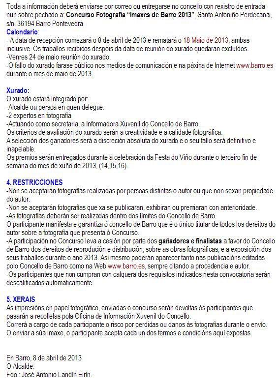 -A participación no Concurso leva a cesión por parte dos gañadores e finalistas a favor do Concello de Barro dos dereitos de reprodución e distribución, sobre as obras fotográficas, e a exposición dos seus traballos durante o ano 2015. Así mesmo poderán aparecer tanto nas publicacións editadas polo Concello de Barro como na Web http://www.barro.es, sempre citando a procedencia e autor.