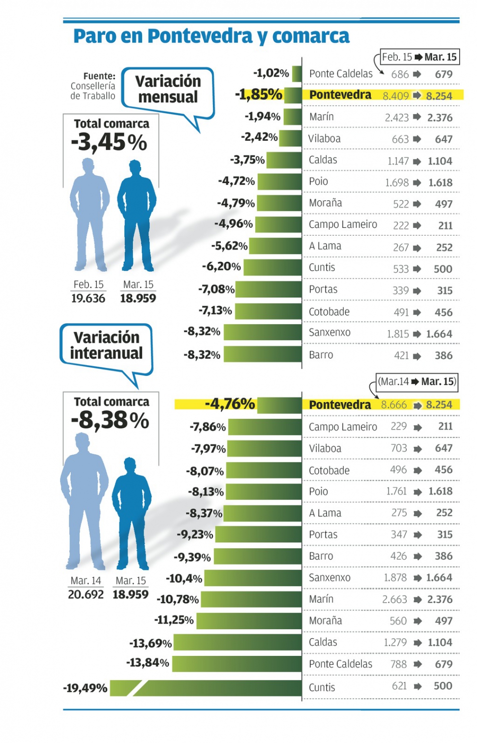 De feito, foi precisamente Sanxenxo o municipio que máis acusou a caída dun mes a outro, cun 66,52 % (1.510) menos de contratos. Pontevedra saldouno cun 17,61 % (553) de descenso e, no extremo contrario, Cerdedo destacou cun incremento do 46,43 % (13). O resto de municipios perderon entre os 697 empregos de Marín e os 9 que gañou Ponte Caldelas, pasando polos 150 que descendeu en Poio e os 264 en Bueu.